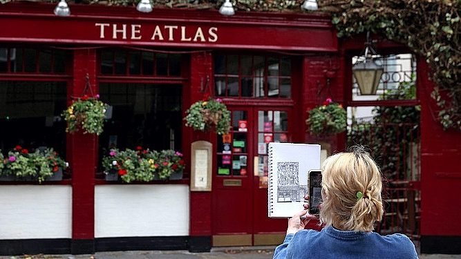 Lydia Wood sits opposite The Atlas pub in west London, meticulously adding detail to her drawing of the building and pausing only occasionally to sharpen her pencil.