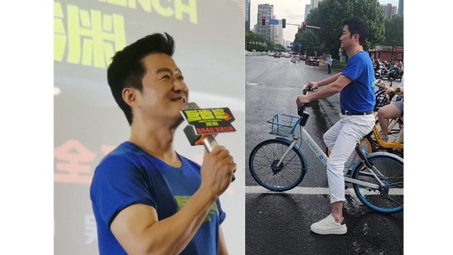 吴京骑脚车赶路演 行人偶遇以为看错