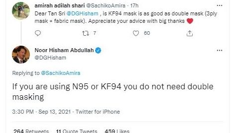 卫生总监丹斯里诺希山表示,如果已经佩戴N95或是KF94口罩,则不需要在佩戴双重口罩。