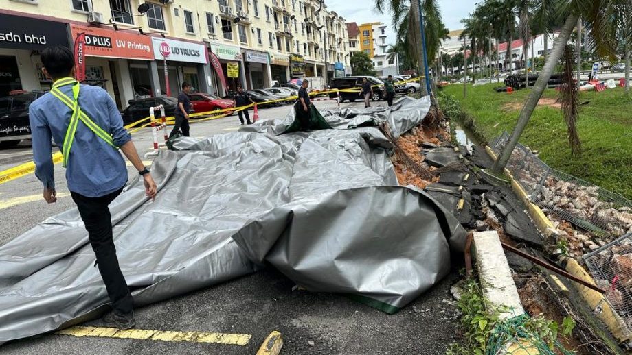 今早清晨的倾盆大雨,导致One Selayang区道路崩塌,情况骇人。事发后,市议会已局部封锁道路崩塌路段,并以帆布遮盖崩塌部分,避免情况恶化。
