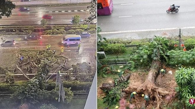 (新加坡1日讯)连夜豪雨,新加坡大巴窑1棵树龄约20年、有8层楼高的大树,今日凌晨时轰然倒下,导致当地泛岛快速公路(PIE)4条车道被挡,引发今早大塞车。 《新明日报》报导,这起事故于今日凌晨4时许发生,地点是在当地金吉道第195座组屋附近,大树倒在泛岛快速公路往樟宜方向的路段。 该报读者叶先生(75岁)说,他凌晨4时许听到“碰”的一声巨响,起初还以为发生车祸,起身查看后才发现是大树倒下。 他透露,由于大树恰好倒在快速公路,虽然是凌晨时分,但也有不少车辆行驶,庆幸没有压到任何交通工具。 他说,由于昨天整夜都在下雨,相信大树或因抵不住强风的吹袭而倒下。 此外,受访居民说,该大树树龄约20年,而许多居民事发时并不知情,直到工作人员前来开始锯树木时,才惊悉发生事故。 根据读者提供的视频,大树倒下后,所有行驶的车辆只能在最右边的车道缓慢行驶,现场也至少有两辆警车,警员到场协助维持秩序。