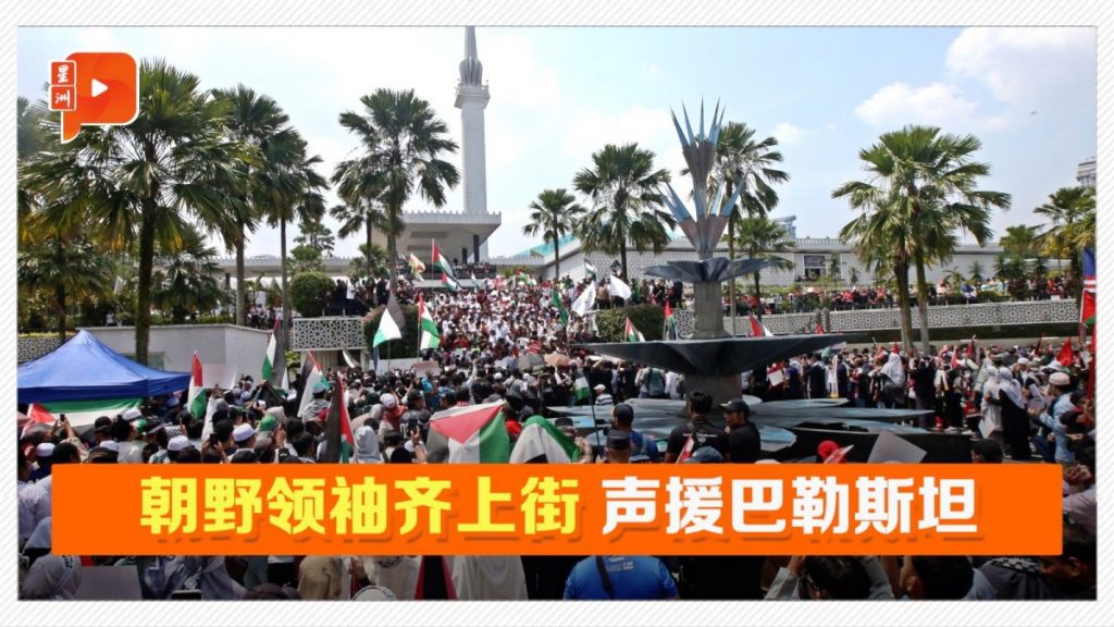 约500人,包括不少朝野领袖,于昨日(10月13日)下午2时聚集朝圣基金局清真寺,参与“马来西亚与巴勒斯坦一起崛起”集会。他们高喊口号,高举大马和巴勒斯坦国旗,步行到美国驻马大使馆外,以抗议美国力挺以色列。