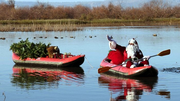 Issa Kassissieh, better known as the Santa Claus of Jerusalem, paddles with a Christmas tree at the Sea of Galilee.