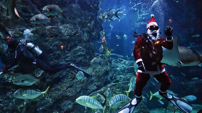 A diver dressed as Santa Claus feeds a shark at the Sea Life Bangkok Ocean World aquarium in Bangkok.