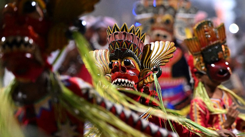 Performers take part in a parade during the annual Perahera festival at the Kelaniya Buddhist Temple northeast of Colombo, Sri Lanka.
