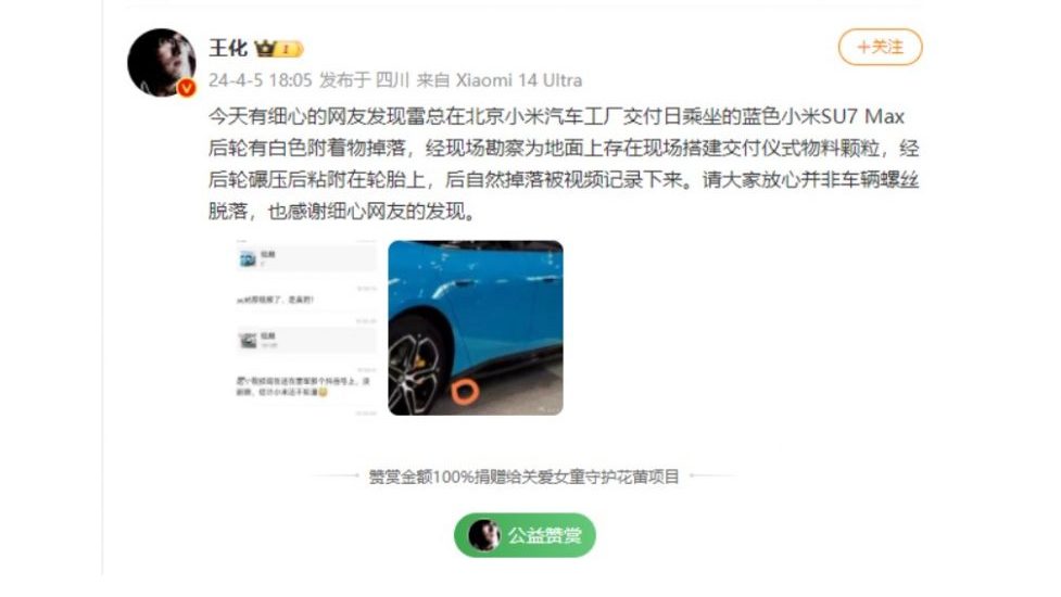 有网民近日发现中国消费电子产品巨头小米集团创始人雷军在交付日乘坐的小米SU7 Max后轮有白色附着物掉落。