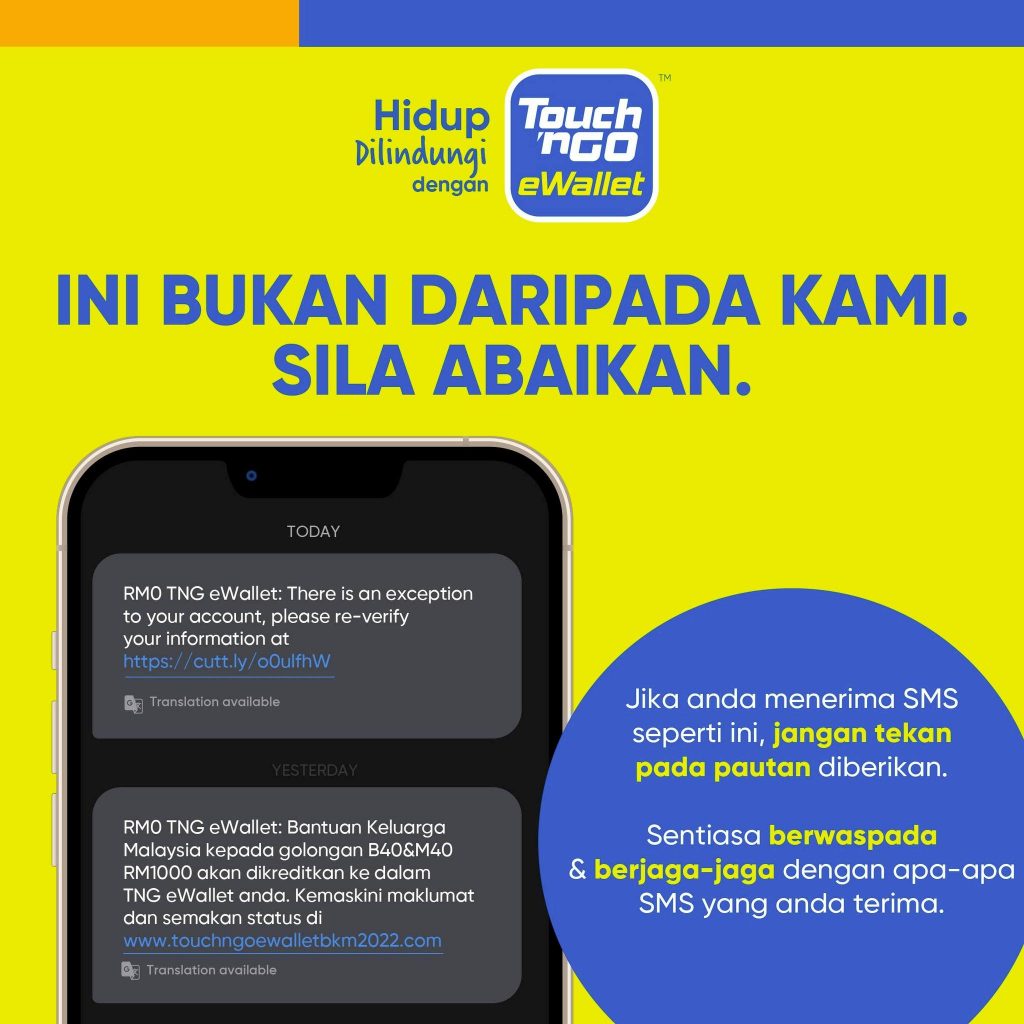 一触即通电子钱包(Touch'n Go eWallet)提醒民众提防接获的诈骗手机短讯,勿点击短讯中的任何链接。