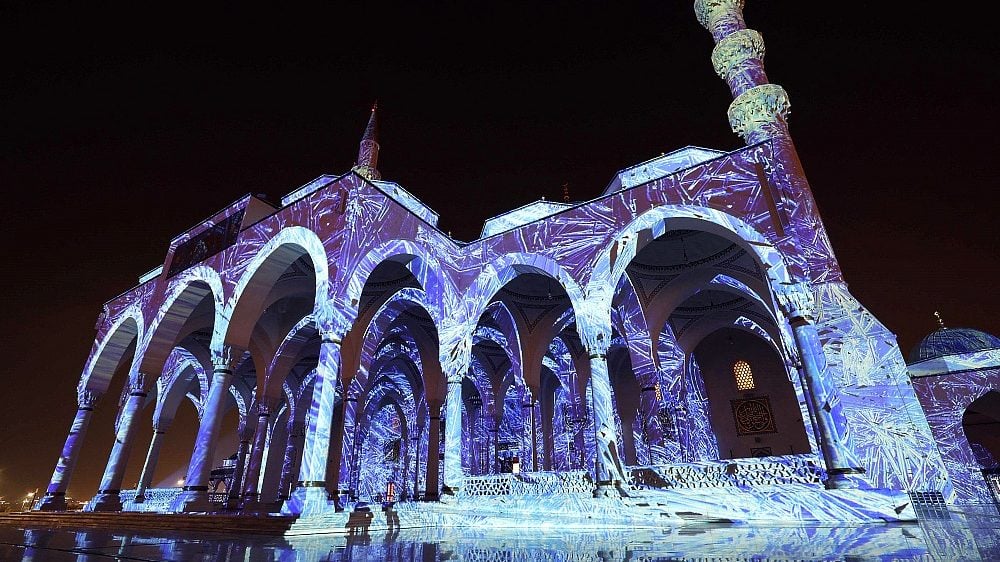 The Sharjah Mosque lit up in a colorful display for the 11th annual Sharjah Light Festival in the emirate of Sharjah, UAE.
