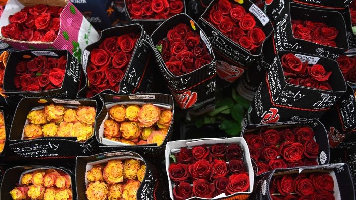 Flowers for sale at a wholesale merchant ahead of the Valentine's Day outside the Southern California Flower Market in Los Angeles.