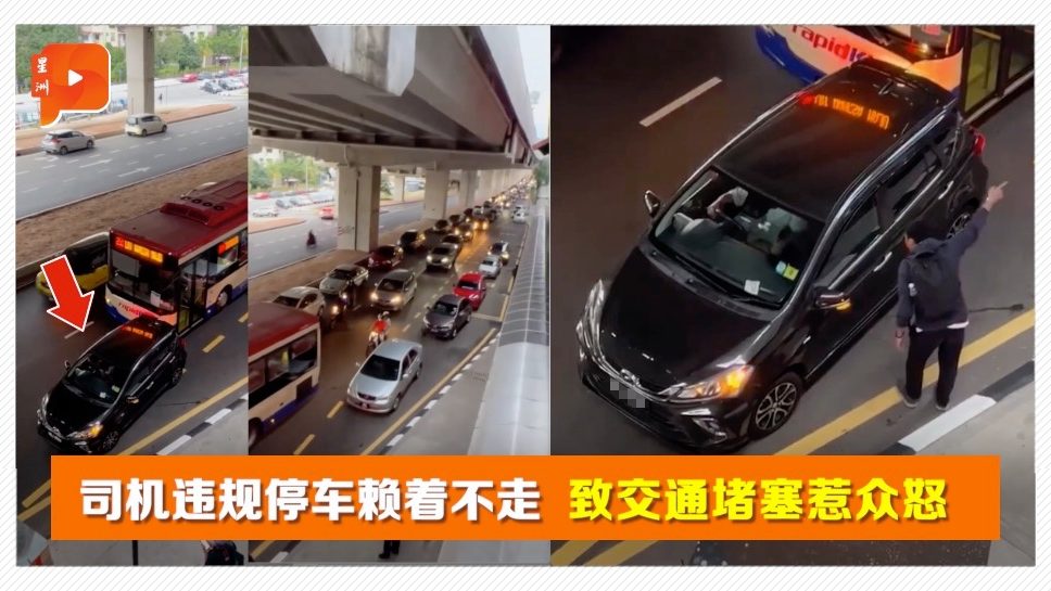 一辆黑色Myvi在Wangsa Maju捷运站违规停车,结果导致繁忙路段上出现长长车龙。司机甚至对后方巴士鸣笛巨响也无动于衷,直到行人上前劝阻才移动寸步。
